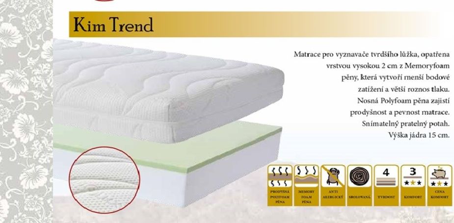 která vytvoří menší bodové zatížení a větší roznos tlaku. Nosná Polyfoam pěna zajistí prodyšnost a pevnost matrace.