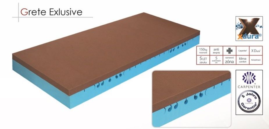 uživatele, je opatřena vrstvou se speciální německé značkové pěny X dura. Tato pěna je svými vlastnostmi (pružnost, prodyšnost, odolnost) to nejlepší a nejmodernější co se na výrobu matrací v současné době používá.