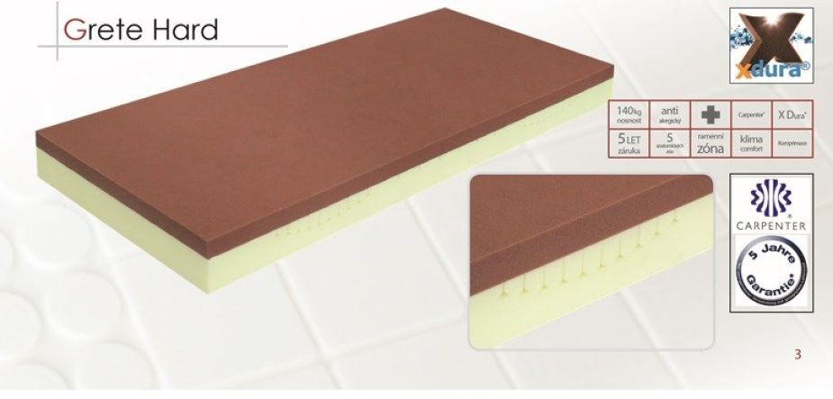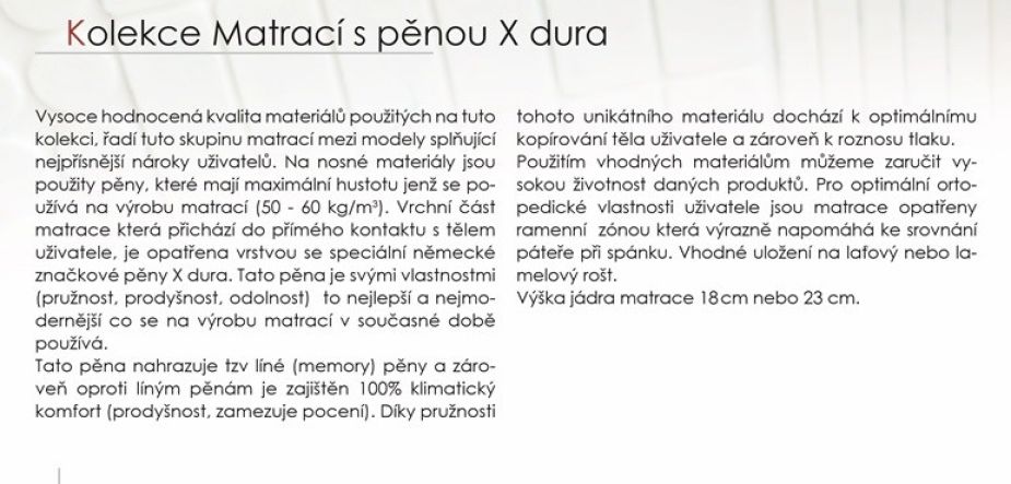 uživatele, je opatřena vrstvou se speciální německé značkové pěny X dura. Tato pěna je svými vlastnostmi (pružnost, prodyšnost, odolnost) to nejlepší a nejmodernější co se na výrobu matrací v současné době používá.