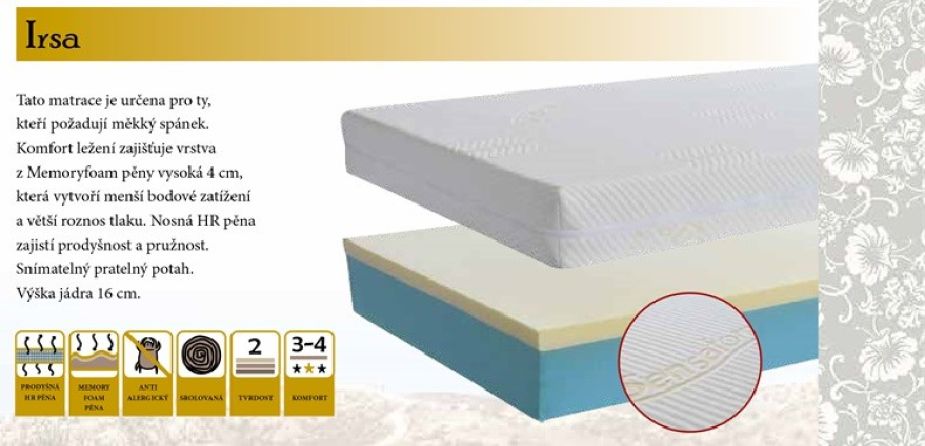 Matrace pro vyznavače středně tuhého spaní. Komfortní ležení zajišťuje vrstva vysoká 4cm z Memoryfoam pěny,