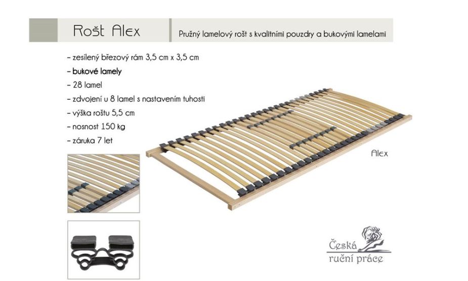 U roštu Alex, našeho nejúspěšnějšího roštu používáme vysoce kvalitní pouzdra a bukové lamely. Bukové lamely zajištují stabilní pružnost a vytrvalost.